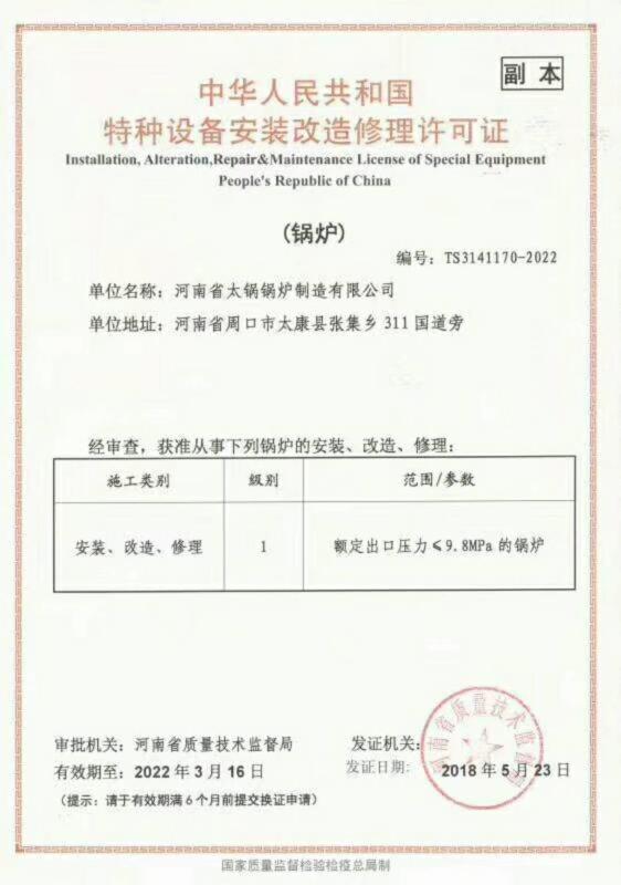 河南省太鍋鍋爐制造有限公司(原河南省太康鍋爐廠(chǎng)始建于1976年)始建于70年代初,經(jīng)40多年的艱辛探索,靠科技興業(yè),走科學(xué)管理之路,現(xiàn)已發(fā)展成為承接制造、安裝、設(shè)計(jì)大、中型供熱系統(tǒng),生產(chǎn):SZS燃油燃?xì)庹羝仩t、燃煤蒸汽鍋爐、燃油鍋爐、燃?xì)忮仩t、電加熱鍋爐、生物質(zhì)鍋爐、茶水鍋爐、有機(jī)熱載體鍋爐、熱風(fēng)鍋爐,蒸壓釜、燃油蒸汽鍋爐、燃?xì)庹羝仩t、燃油熱水鍋爐、燃?xì)鉄崴仩t并承擔(dān)安裝120噸熱水鍋爐、蒸汽鍋爐,生物質(zhì)鍋爐,加工制造一、二類(lèi)蒸壓釜、壓力容器,化工機(jī)械的省一級(jí)**企業(yè)。